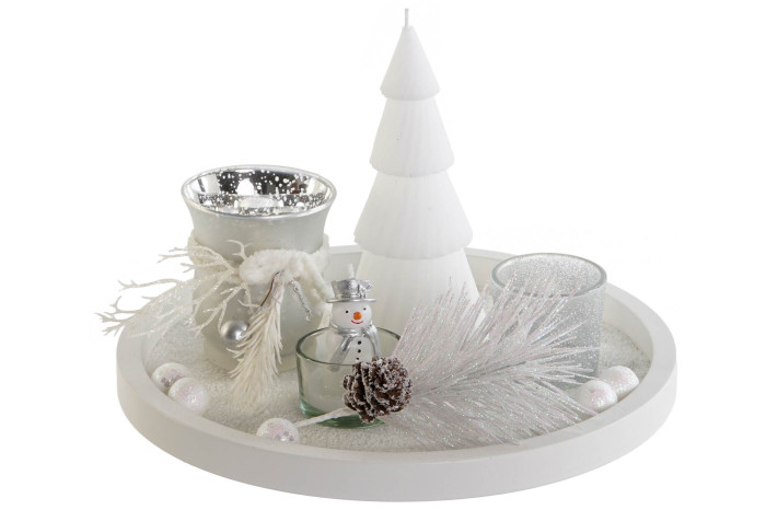La base del centro de mesa en madera color blanco compuesto por una vela en forma de árbol blanco , 2 vasos de cristal , uno pequeño en color plata y el otro pequeño transparente con una vela en forma de muñeco de nieve y ramas de pino con bolas blancas en color blanco brillo con piñas, que añaden un toque natural y festivo.