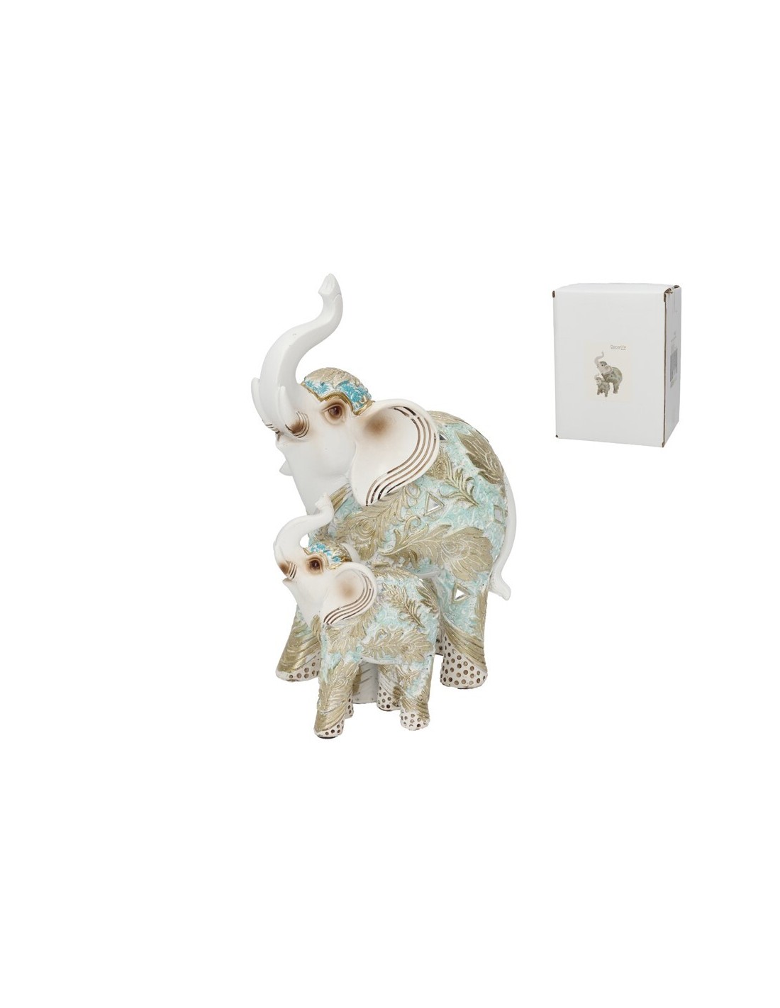 Esta hermosa figura de resina presenta un elefante y su bebé, una representación conmovedora de amor y protección. Los suaves tonos blancos y turquesas se entrelazan, creando una estética serena y elegante. Los delicados toques dorados añaden un brillo sutil que resalta los detalles de la escultura, elevando su belleza. Perfecta para adornar estanterías, mesas o cualquier rincón de tu hogar, esta figura no solo es una pieza decorativa, sino también un símbolo de unión familiar y ternura.