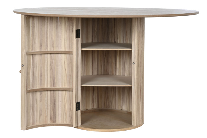 El acabado en madera resalta la belleza natural del material, aportando calidez y carácter a cualquier espacio. La superficie amplia es perfecta para servir comidas y decoraciones, mientras que su base sólida garantiza estabilidad y durabilidad.
